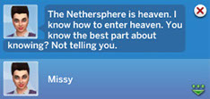 Missy is a ime Lady also known as the Master or Harold Saxon. She created the Nethersphere, so she can control Sims after death. If a Sim dies, he enters "heaven" and is being converted to a Cyberman. So Missy plays the main role when it comes to rule over he world...or the death. You can try to interact with her, but she can be very sassy.